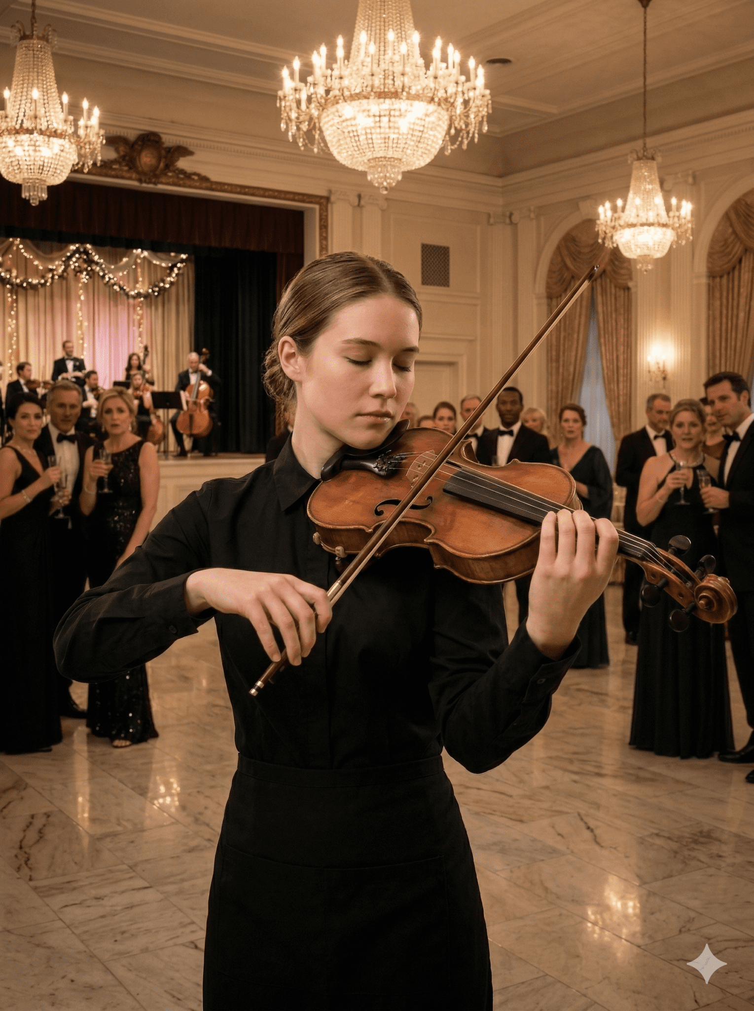 Razgovor je odmah prestao. Lusteri su se činili kao da podrhtavaju dok se zvuk širio prostorijom i pretvarao u nešto daleko snažnije nego što je itko očekivao. Mlada konobarica nije izgledala nervozno. Oči su joj bile zatvorene, držanje mirno, pokreti precizni.