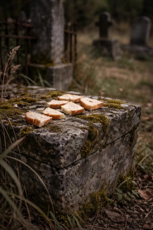 Osim što na groblju nikada nije vidjela golubove ili vrapce. Djevojčica se oprezno približavala ne samo očevom grobu već i susjednom – starom s pocrnjelim kamenom i izblijedjelom fotografijom. Stavljala bi kore kruha na ploču, pažljivo ih slažući, kao da postavlja stol. Zatim bi odlazila u tišini.