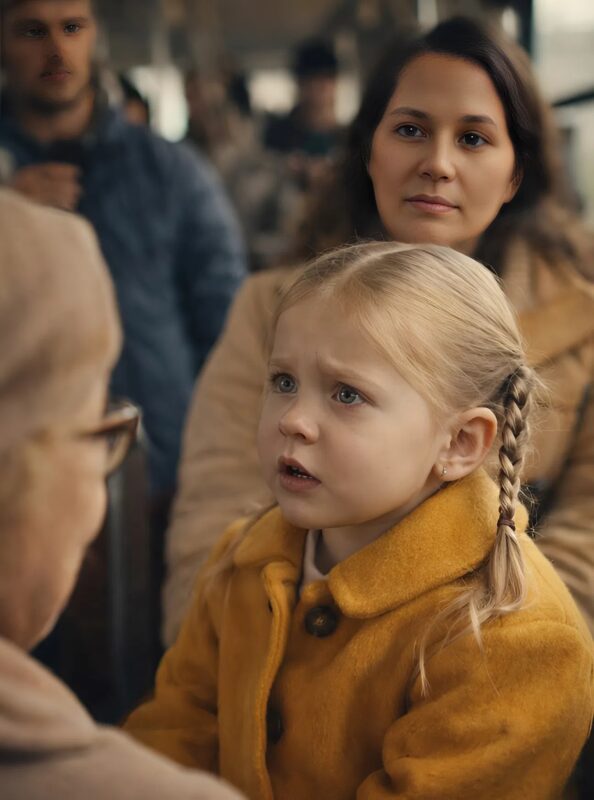 Starica se osvrnula. Pogled joj je prelazio preko redova sjedala dok se nije zaustavio na djevojčici od oko pet godina, koja je sjedila na rubu sjedala pored svoje majke. Djevojčica je nosila jarko žuti kaput i pažljivo je promatrala ulicu.